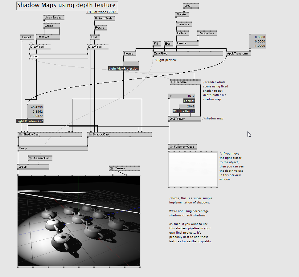 This patch and shader demonstrate how you can use a depth buffer as a shadow map to cast shadows from a light source.