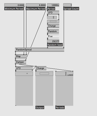 Credits: | make more chaos. outputs a spread of "a-rhythmic" bangs in a definable range of frequency. a high period results in slow changes of "rhythm" a low period results in more unpredictable changes |