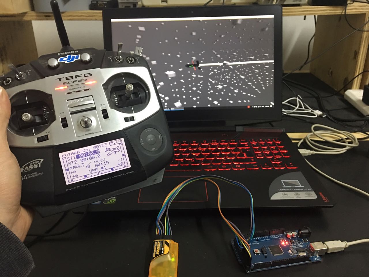 I was looking a way to implement a rc radio ( like futaba ones ) into VVVV by using the training port, but that kills the "wireless" of the system, the easy way of doing it is reading each channel PWM of the standar RC reciver by using an arduino, that is a Little bit complex, but I found a quick arduino sketch that solves it using interrupt, so the only electronics involve its 10 jumper wires, positive, negative, and 8 for each chanel.