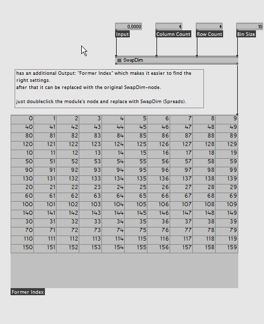 has an additional Output: "Former Index" which makes it easier to find the right settings. after that it can be replaced with the original SwapDim-node.