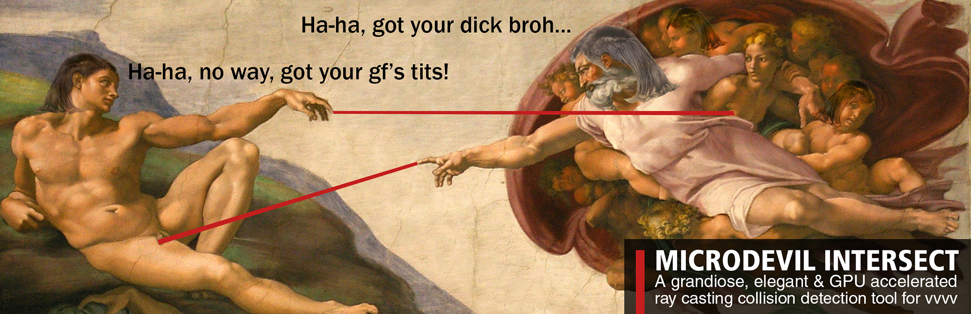 Microdevil Intersect will solve all your collision detection problems and provide your family with the right amount of offensive laughter in the warm comfort of your own home (unless you live with Pedro in his cold and bleak sex-dungeon-stroke-crystal-meth-lab). I can already hear some of you cheer and tap your feet in anticipation and trepidation at the joy of building all these penis-based ray casting apps... Fear not my friend, the truth about ray casting has finally landed in your humble abode, and, for once, the truth is more than half a sausage.