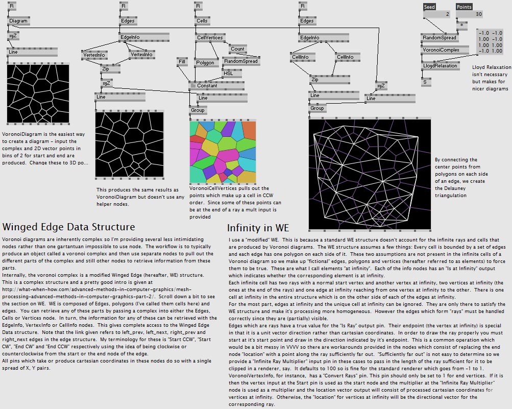 This contribution consists of several nodes which expose the information in a winged edge representation of a voronoi diagram. The winged edge structure comes from a C# Voronoi DLL I wrote long ago which uses Fortune's algorithm. The details are somewhat unavoidably complex but I've done my best to explain most of them in the supplied sample patch. Allows for Lloyd relaxation and there's some other stuff which I will probably expose sometime such as an intersection routine for convex polygons. The information in the Winged Edge structure give access to pretty much anything concerning the diagram. The Delaunay triangulation is trivial to derive from it, individual cells and the points which make up their polygon are easily produced, adjacency relations for all cells, vertices and edges are all available. Hopefully this is at least understandable to the point that somebody out there can make use of it.