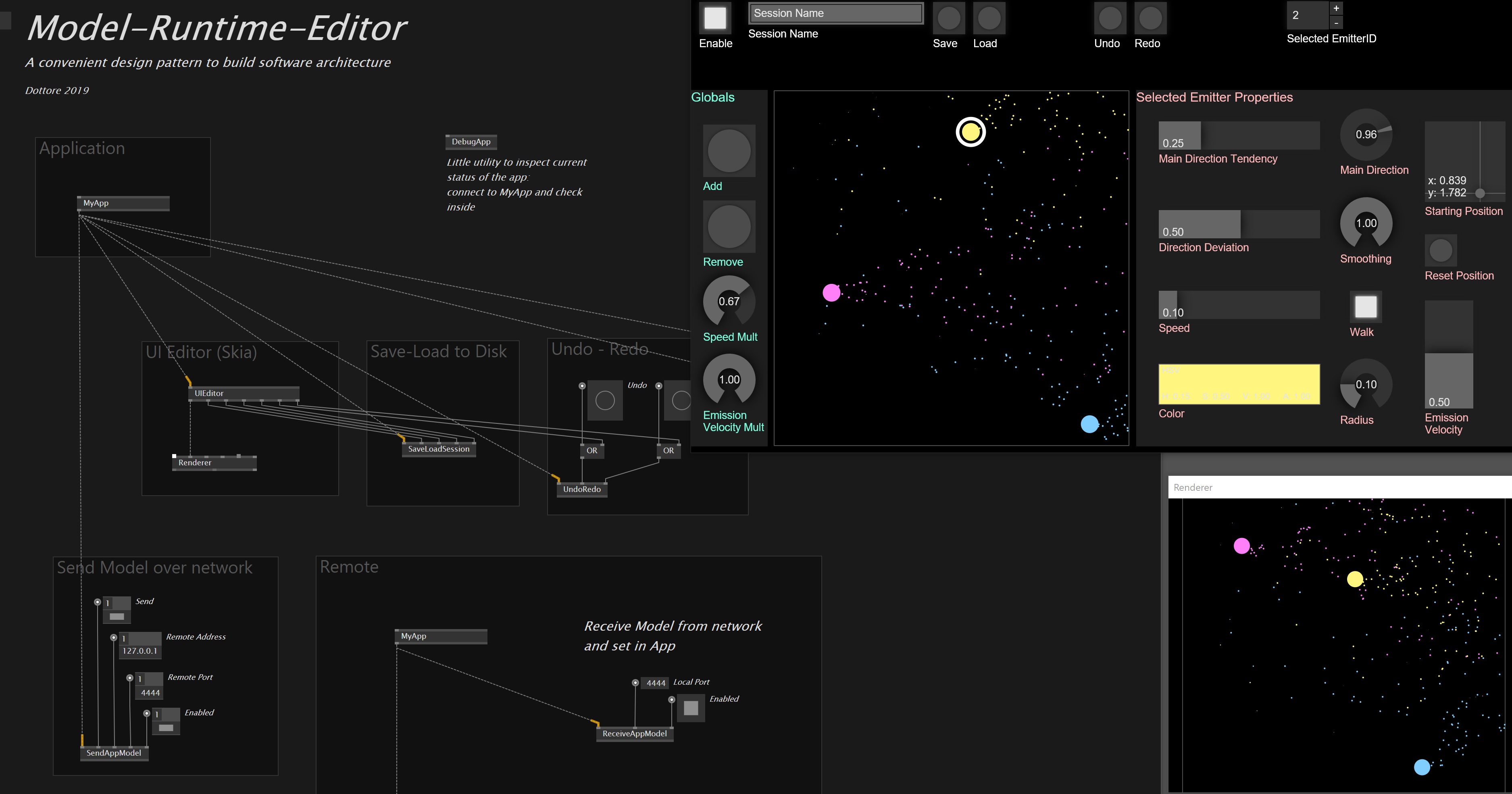 Almost two years ago I started studying vl. I immediately realised that vl (vvvv gamma) was finally the language in which many things can be correctly expressed, allowing the user to choose the most appropriate approaches to programming without all the restrictions of vvvv beta. This is a collection of patches about the Model-Runtime-Editor design pattern, a convenient way to structure your software and build a flexible app architecture. It comes out of the research that I'm doing since 2 years about vl software development. During this research I had great support from the vvvv team, who helped in finding and exploring this and many other programming patterns.