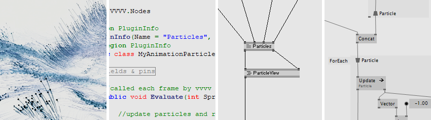 Interactive realtime 2d/3d animated cyber particles. vvvv has it all. Featuring 3 distinct fully blown industry standard rendering engines