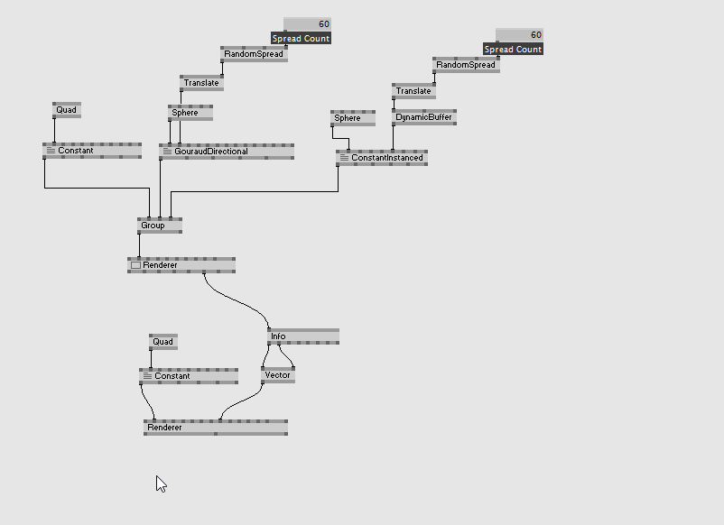Our vvvv pipeline will call Update/Render using Info as a starting point. So all of the above will be processed. Since we also need the runtime to fully complete the draw calls, our Info node (which doesn't do much), will actually under the hood provoke quite a big chain of actions.